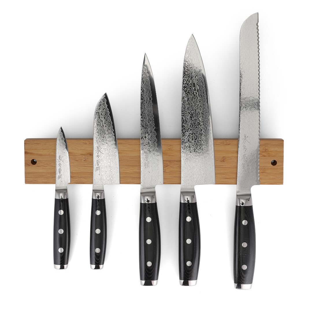 20cm kokkekniv, 8 cm urtekniv, 13 cm santoku, 18 cm kødkniv, 23 cm brødkniv og knivmagnet i naturfarvet bambus.